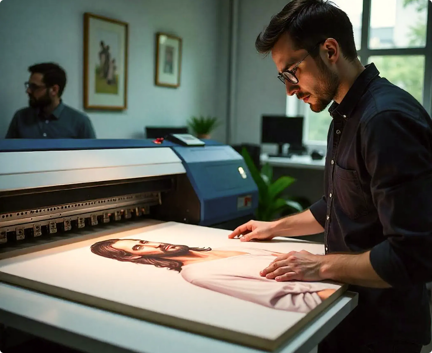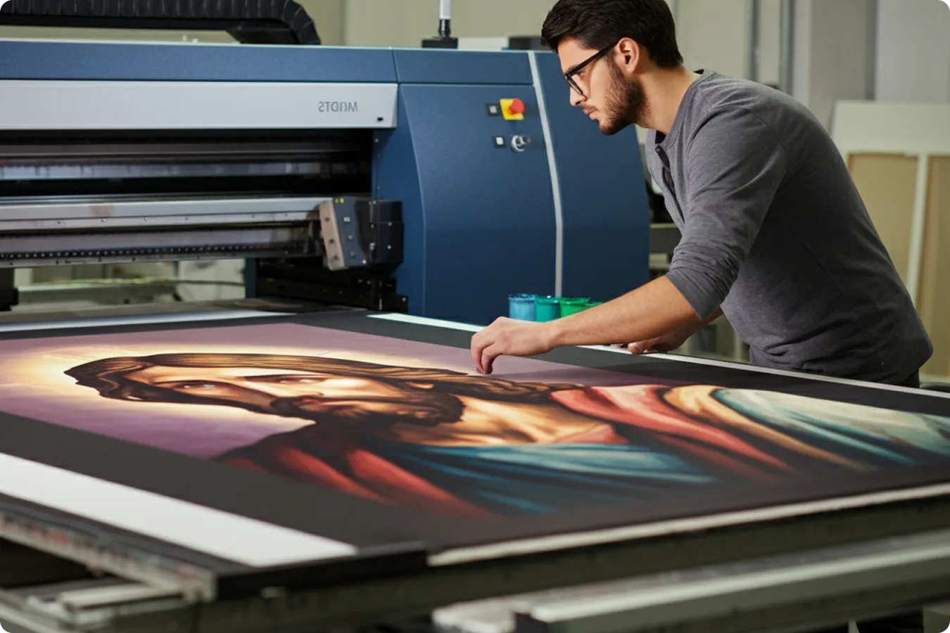 Impreso con tintas Greenguard Gold con certificación UL para obtener colores intensos y resistentes a la decoloración que dan vida a la imagen de Cristo.